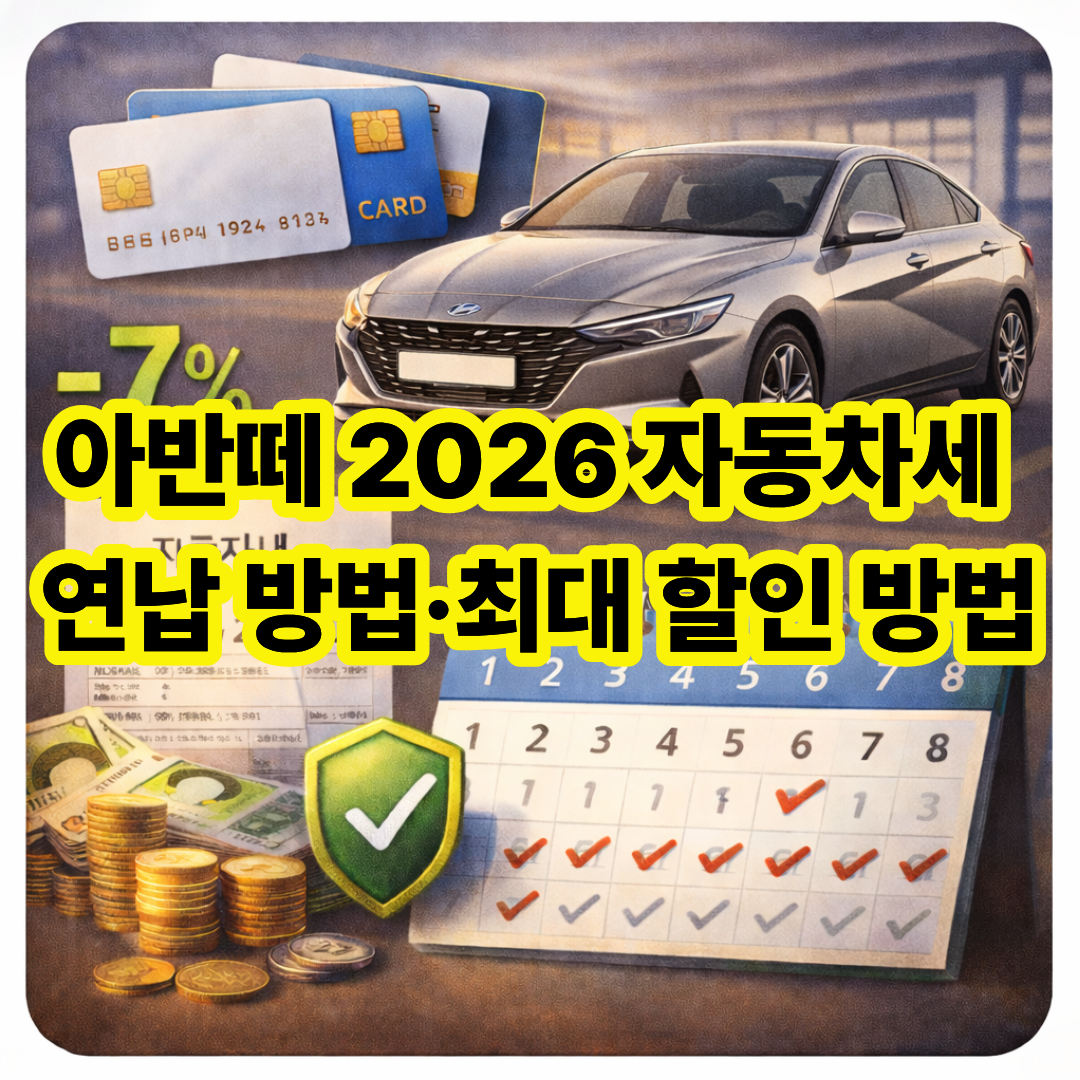 아반떼는 준중형이라 세금 부담이 적은 편이지만, 연납하고 카드 혜택까지 챙기면 3~5만원은 더 아낄 수 있습니다. 2026년부터 연납 할인율이 줄어든 만큼 카드 혜택이 더 중요해졌습니다.