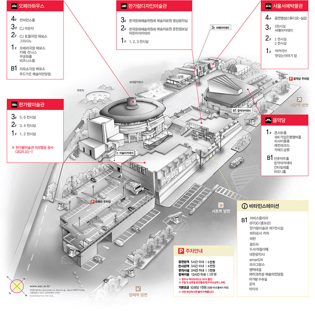 예술의전당은 정말 좋은 공연, 전시가 많잖아? 주차 걱정 없이 편하게 문화생활 즐기길 바라! 궁금한 거 있으면 예술의전당 고객센터(1668-1352)로 문의하면 친절하게 알려준대.