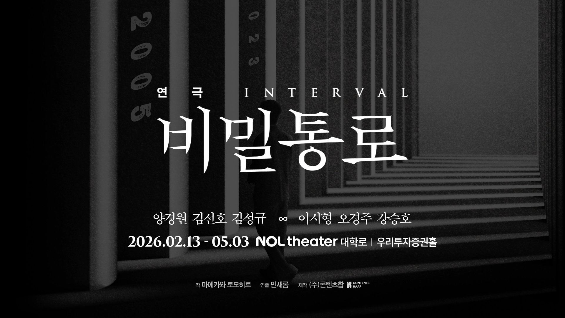 비밀통로 : INTERVAL (NOL 씨어터 대학로 우리투자증권홀, 2월~5월 3일) — R석 77,000원, S석 66,000원. 기억을 잃은 채 낯선 공간에서 마주한 두 사람의 이야기로, 김선호·양경원·김성규가 출연합니다. 일본 극작가 에카와 토모히로의 작품을 민새롬 연출이 무대에 올렸습니다. 주말 회차는 오픈 후 1분 내외로 매진되는 경우가 많아 평일 저녁 회차를 노리는 것이 현실적입니다. 예매처는 NOL티켓과 티켓링크 두 곳입니다.